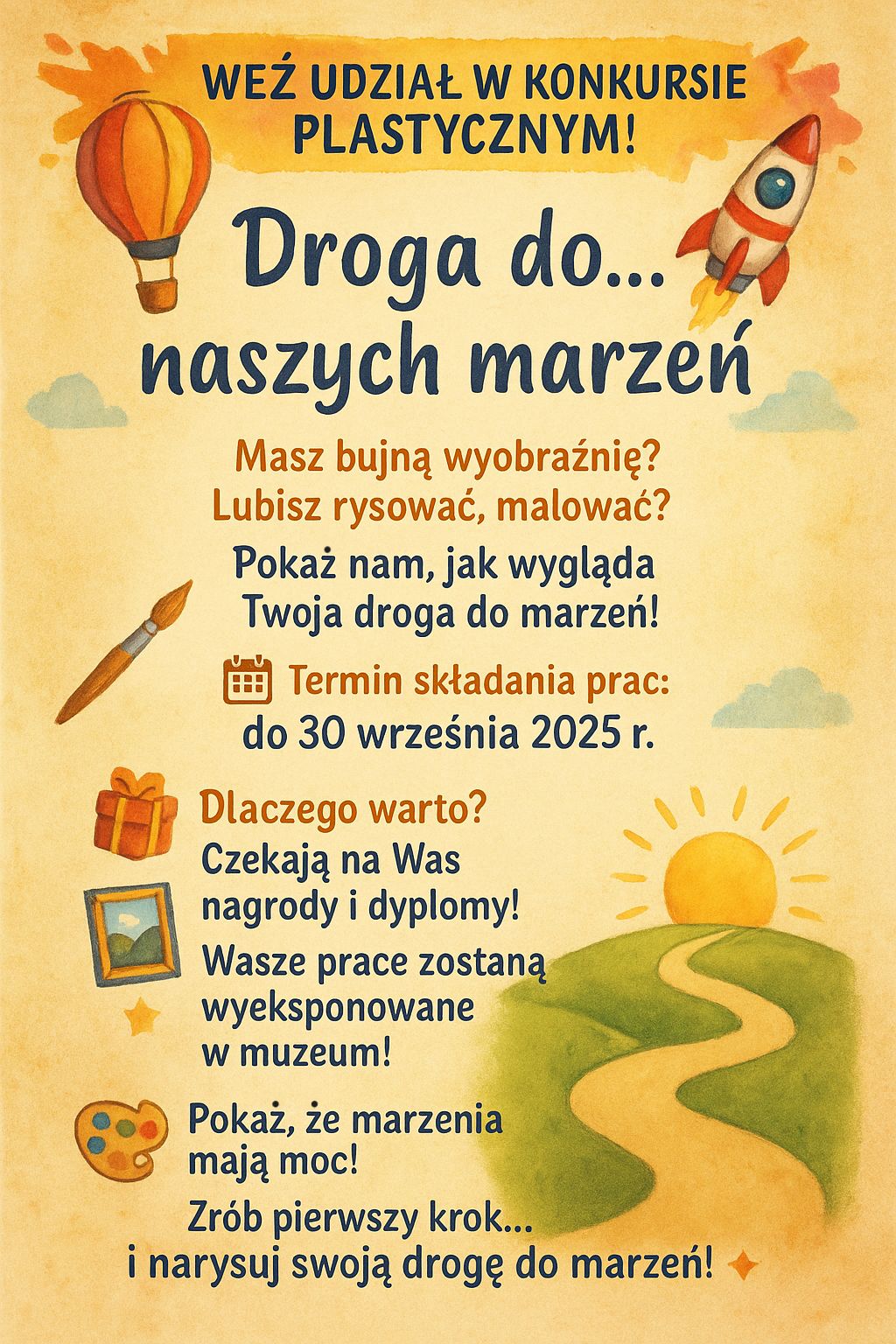 Jeśli macie bogatą wyobraźnię, lubicie rysować i malować, to zapraszamy Was do udziału w konkursie plastycznym! �� „Droga do… naszych marzeń”